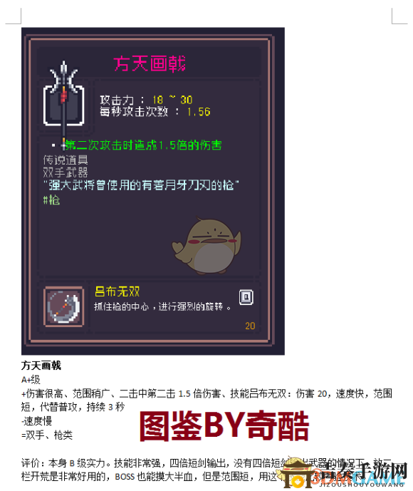 在《Dungreed》的戰(zhàn)場(chǎng)上,方天畫(huà)戟作為一把雙手神兵,以其獨(dú)特的第二次攻擊1.5倍傷害和強(qiáng)大的技能,成為了無(wú)數(shù)玩家爭(zhēng)相擁有的利器。今天,就讓我們跟隨“奇酷上傳”的步伐,深入剖析這把傳奇武器的數(shù)據(jù)評(píng)測(cè),一探究竟!